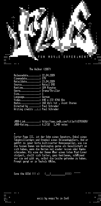 | FiLENAME: | The.Walker.German.2007.DVDRiP.XviD-FmE.avi |
