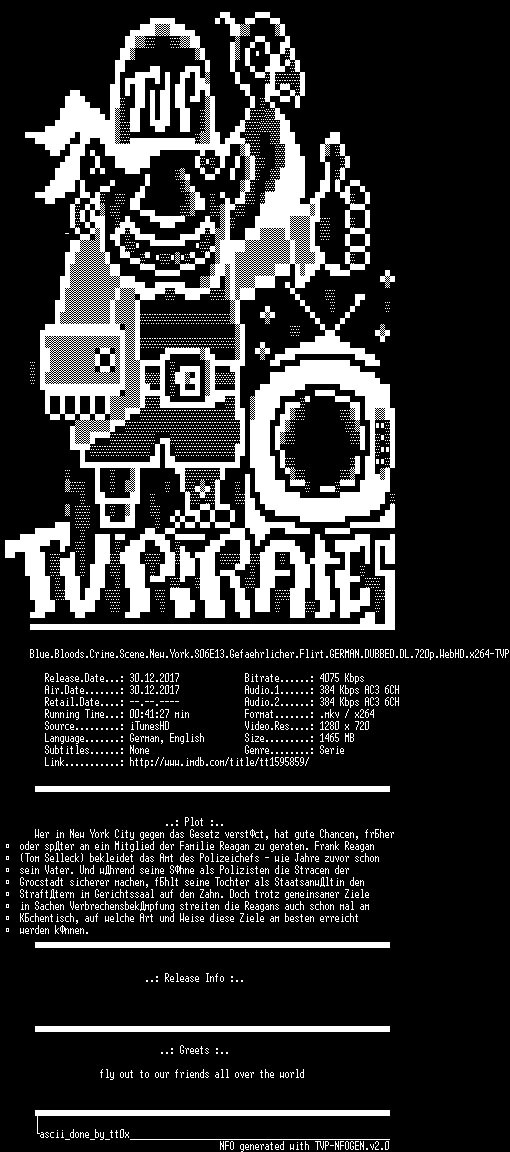 | FiLENAME: | Blue.Bloods.Crime.Scene.New.York.S06E13.Gefaehrlicher.Flirt.GERMAN.DUBBED.DL.720p.WebHD.x264-TVP.mkv |