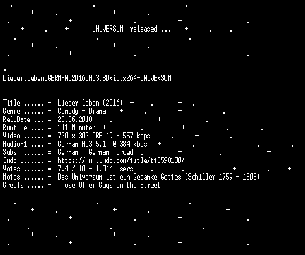 | FiLENAME: | Lieber.leben.GERMAN.2016.AC3.BDRip.x264-UNiVERSUM.mkv |
