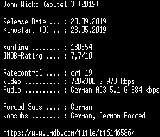| FiLENAME: | John.Wick.Kapitel.3.German.2019.AC3.BDRip.x264-COiNCiDENCE.mkv |