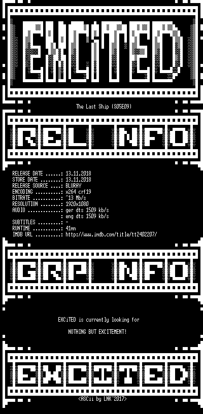 | FiLENAME: | The.Last.Ship.S05E09.German.DL.1080p.BluRay.x264-EXCiTED.mkv |