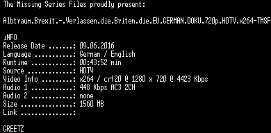 | FiLENAME: | Albtraum.Brexit.-.Verlassen.die.Briten.die.EU.GERMAN.DOKU.720p.HDTV.x264-TMSF.mkv |