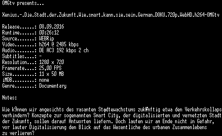 | FiLENAME: | Xenius.-.Die.Stadt.der.Zukunft.Wie.smart.kann.sie.sein.German.DOKU.720p.WebHD.h264-OMGtv.mkv |