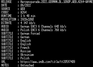 | FiLENAME: | Herzensparade.2022.GERMAN.DL.1080P.WEB.X264-WAYNE.mkv |