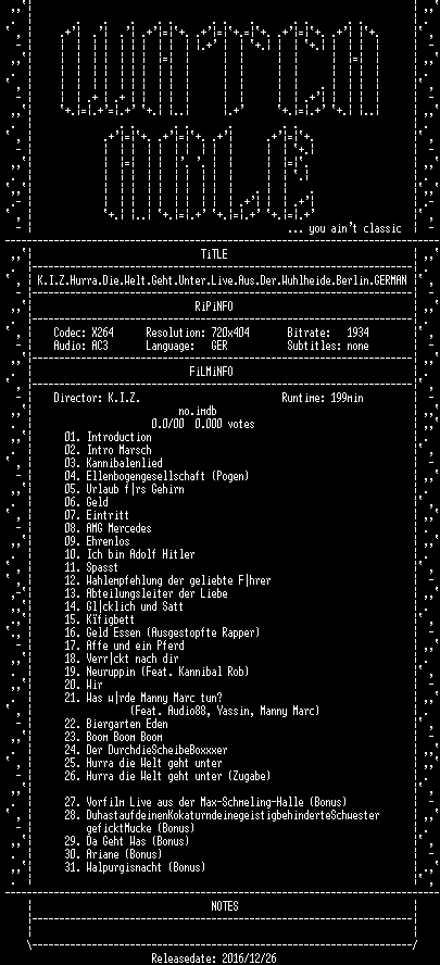 | FiLENAME: | K.I.Z.Hurra.Die.Welt.Geht.Unter.Live.Aus.Der.Wuhlheide.Berlin.GERMAN.2016.BDRiP.x264-WATCHABLE.mkv |
