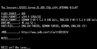 | FiLENAME: | The.Innocents.S01E01.German.DL.WEB.720p.x264.iNTERNAL-BiGiNT.mkv |