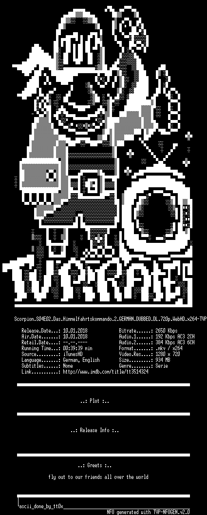 | FiLENAME: | Scorpion.S04E02.Das.Himmelfahrtskommando.2.GERMAN.DUBBED.DL.720p.WebHD.x264-TVP.mkv |