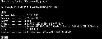 | FiLENAME: | Hollywood.S01E02.GERMAN.DL.720p.WEBRip.x264-TMSF.mkv |