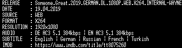 | FiLENAME: | Someone.Great.2019.GERMAN.DL.1080P.WEB.X264.INTERNAL-WAYNE.mkv |