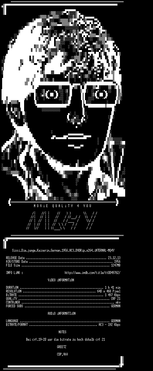 | FiLENAME: | Sissi.Die.junge.Kaiserin.German.1956.AC3.DVDRip.x264.iNTERNAL-MQ4Y.mkv |
