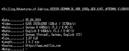 | FiLENAME: | Chilling.Adventures.of.Sabrina.S02E09.GERMAN.DL.HDR.1080p.WEB.h265.iNTERNAL-EiSBOCK.mkv |