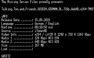 | FiLENAME: | Talking.Tom.and.Friends.S01E04.GERMAN.DL.720p.WebHD.x264-TMSF.mkv |
