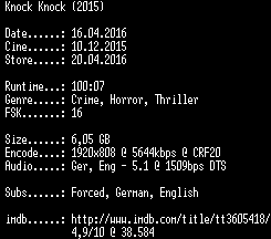 | FiLENAME: | Knock.Knock.2015.German.DL.DTS.1080p.BluRay.x264-CiNEViSiON.mkv |