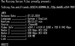 | FiLENAME: | Talking.Tom.and.Friends.S01E34.GERMAN.DL.720p.WebHD.x264-TMSF.mkv |
