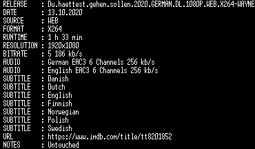 | FiLENAME: | Du.haettest.gehen.sollen.2020.GERMAN.DL.1080P.WEB.X264-WAYNE.mkv |