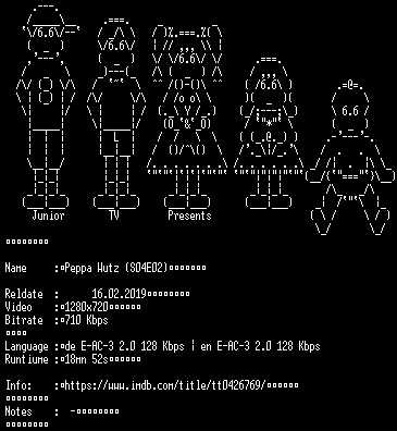 | FiLENAME: | Peppa.Wutz.S04E02.German.DL.720p.WEBHD.x264-JuniorTV.mkv |