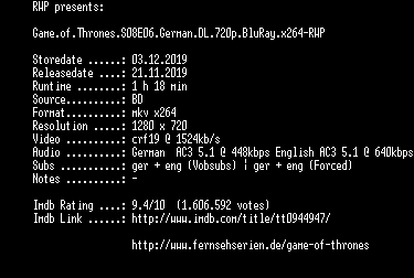 | FiLENAME: | Game.of.Thrones.S08E06.German.DL.720p.BluRay.x264-RWP.mkv |