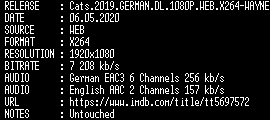 | FiLENAME: | Cats.2019.GERMAN.DL.1080P.WEB.X264-WAYNE.mkv |