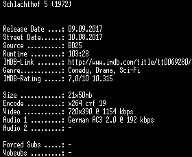 | FiLENAME: | Schlachthof.5.German.REMASTERED.1972.AC3.BDRip.x264-SPiCY.mkv |