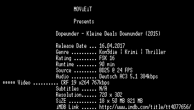 | FiLENAME: | DopeUnder.Kleine.Deals.Downunder.German.2015.AC3.BDRip.x264-MOViEiT.mkv |