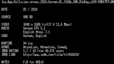| FiLENAME: | Ice.Age.Kollision.voraus.2016.German.DL.2160p.UHD.BluRay.x265.FiX-ENDSTATiON.mkv |
