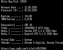 | FiLENAME: | White.Boy.Rick.2018.German.DTS.DL.1080p.BluRay.x264-COiNCiDENCE.mkv |