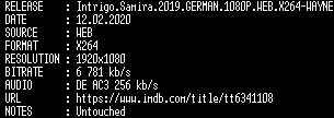 | FiLENAME: | Intrigo.Samira.2019.GERMAN.1080P.WEB.X264-WAYNE.mkv |