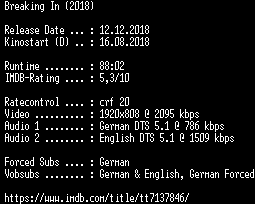 | FiLENAME: | Breaking.In.2018.German.DTS.DL.1080p.BluRay.x264-COiNCiDENCE.mkv |