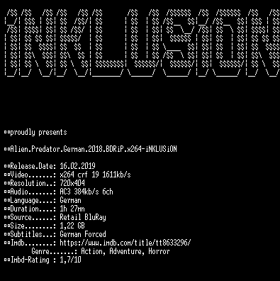 | FiLENAME: | Alien.Predator.German.2018.BDRiP.x264-iNKLUSiON.mkv |