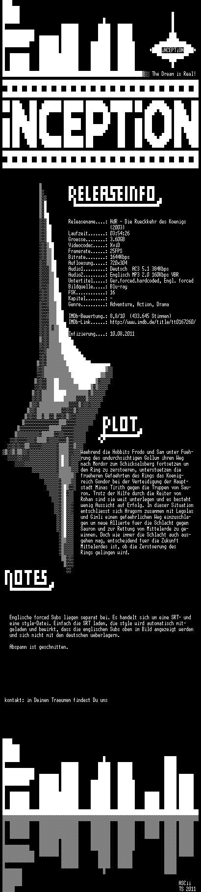 | FiLENAME: | Der.Herr.der.Ringe.Die.Rueckkehr.des.Koenigs.2003.SEE.German.AC3.DL.BDRip.XviD-iNCEPTiON.avi |