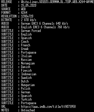 | FiLENAME: | White.Lines.S01E03.GERMAN.DL.720P.WEB.X264-WAYNE.mkv |