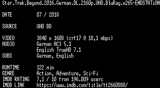 | FiLENAME: | Star.Trek.Beyond.2016.German.DL.2160p.UHD.BluRay.x265-ENDSTATiON.mkv |