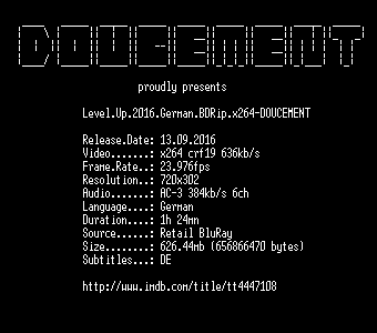 | FiLENAME: | Level.Up.2016.German.BDRip.x264-DOUCEMENT.mkv |