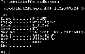 | FiLENAME: | The.Good.Fight.S02E08.Tag.457.GERMAN.DL.720p.HDTV.x264-TMSF.mkv |