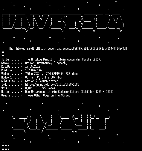 | FiLENAME: | The.Whiskey.Bandit.Allein.gegen.das.Gesetz.GERMAN.2017.AC3.BDRip.x264-UNiVERSUM.mkv |