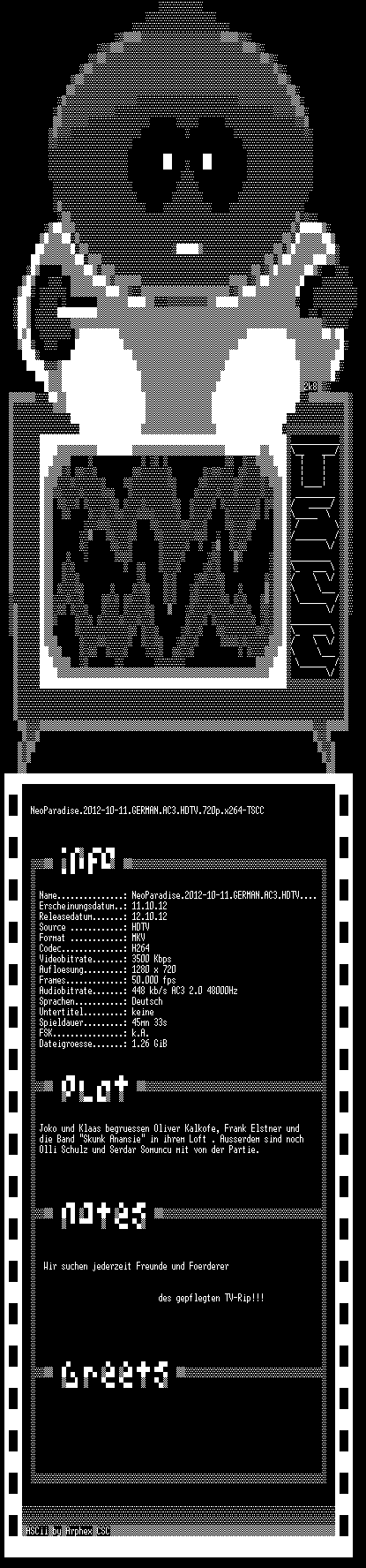 | FiLENAME: | NeoParadise.2012-10-11.GERMAN.HDTV.720p.x264-TSCC.mkv |
