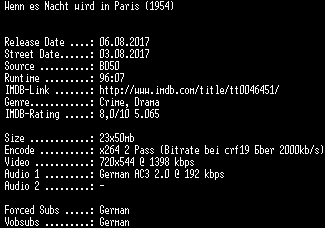 | FiLENAME: | Wenn.es.Nacht.wird.in.Paris.German.REMASTERED.1963.AC3.BDRip.x264-SPiCY.mkv |