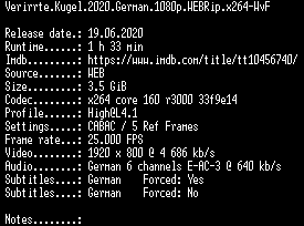 | FiLENAME: | Verirrte.Kugel.2020.German.1080p.WEBRip.x264-WvF.mkv |