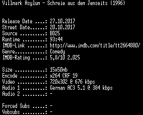 | FiLENAME: | Villmark.Asylum.Schreie.aus.dem.Jenseits.German.2015.AC3.BDRip.x264-SPiCY.mkv |