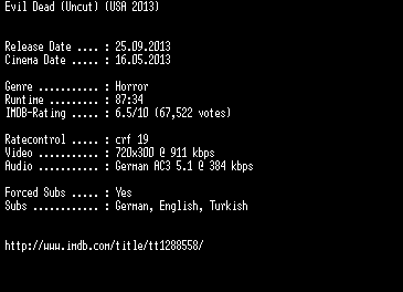 | FiLENAME: | Evil.Dead.UNCUT.German.DVDRiP.x264-EXQUiSiTE.mkv |