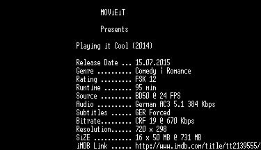 | FiLENAME: | Playing.It.Cool.GERMAN.2014.AC3.BDRip.x264-MOViEiT.mkv |