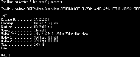 | FiLENAME: | The.Walking.Dead.S09E09.Home.Sweet.Home.GERMAN.DUBBED.DL.720p.WebHD.x264.iNTERNAL.REPACK-TMSF.mkv |