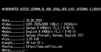 | FiLENAME: | MINDHUNTER.S02E02.GERMAN.DL.HDR.1080p.WEB.h265.iNTERNAL-EiSBOCK.mkv |