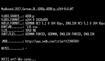 | FiLENAME: | Mudbound.2017.German.DL.1080p.WEBRip.x264-BiGiNT.mkv |