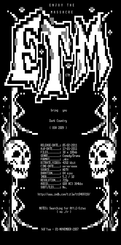 | FiLENAME: | The Dark Country (2009) [GER 720p HDTV].mkv |