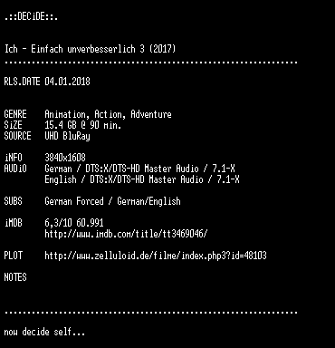 | FiLENAME: | Ich.Einfach.unverbesserlich.3.2017.GERMAN.DL.2160p.UHD.BluRay.x265-DECiDE.mkv |