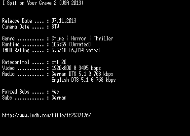 | FiLENAME: | I.Spit.on.Your.Grave.2.UNRATED.2013.German.DL.1080p.BluRay.x264-EXQUiSiTE.mkv |