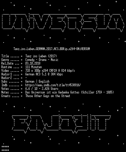 | FiLENAME: | Tanz.ins.Leben.GERMAN.2017.AC3.BDRip.x264-UNiVERSUM.mkv |