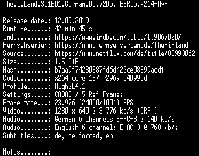 | FiLENAME: | The.I.Land.S01E01.German.DL.720p.WEBRip.x264-WvF.mkv |