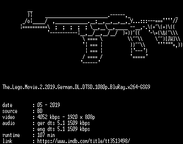 | FiLENAME: | The.Lego.Movie.2.2019.German.DL.DTSD.1080p.BluRay.x264-GSG9.mkv |